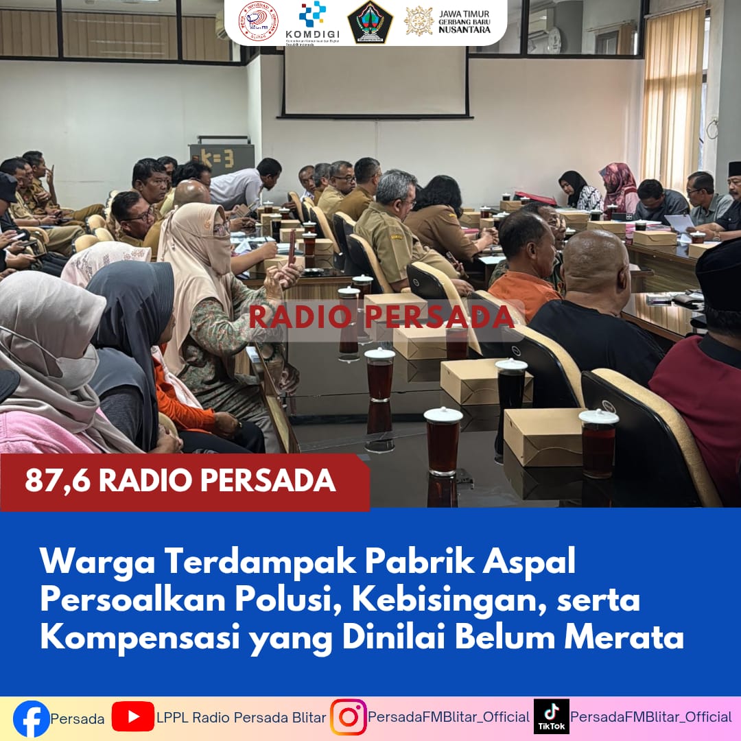 PersadaFM – Warga sekitar pabrik aspal PT Moderna Beton Perkasa di Kelurahan Babadan, Kecamatan Wlingi, menyampaikan keluhan terkait dampak operasional pabrik dalam rapat dengar pendapat (hearing) DPRD Kabupaten Blitar, Senin (2/2).