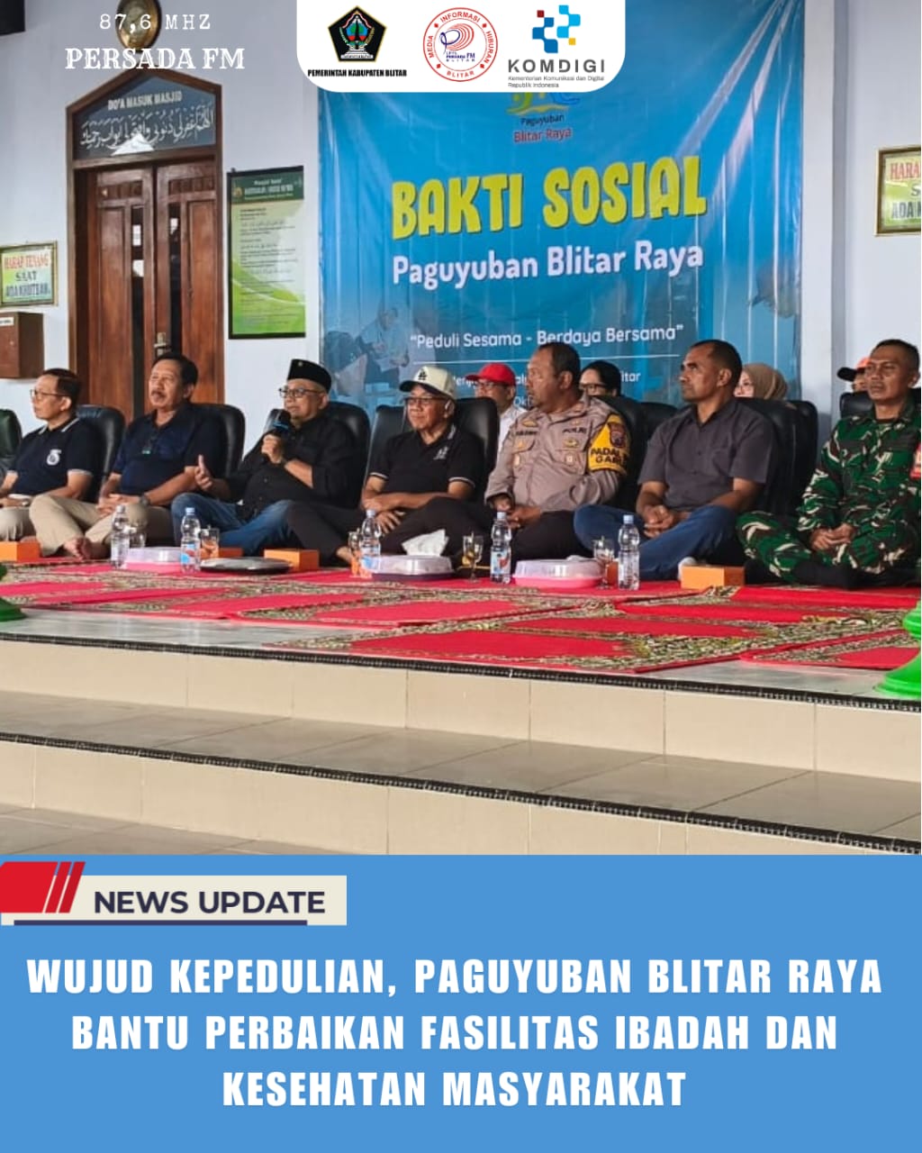 PersadaFM – Dalam upaya meningkatkan kepedulian terhadap masyarakat di kampung halaman, Paguyuban Blitar Raya menggelar kegiatan bakti sosial kesehatan, pembagian sembako, dan renovasi fasilitas masjid di Masjid Baitul Makmur dan Dusun Menjangan Kalung, Desa Slorok, Kecamatan Garum, Kabupaten Blitar, pada Sabtu (11/10/2025).
